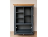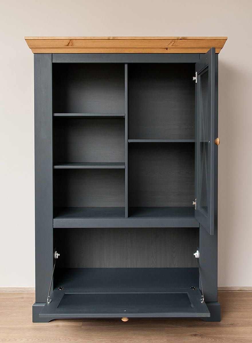 одна стеклянная и одна откидная дверка, за стеклянной дверкой одна деревянная полка.