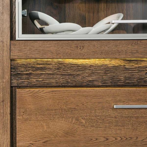 VELVET 12 Витрина SZYNAKA (Witryna 4-drzwiowa wysoka) модульной системы Вельвет ШИНАКА имеет четыре двери. За верхней левой дверью со вставкой из прозрачного закаленного стекла в алюминиевой раме расположены три стеклянные полки. В нижнем отделении установлена одна полка. Фасад украшен горизонтальной подсвеченной вставкой.