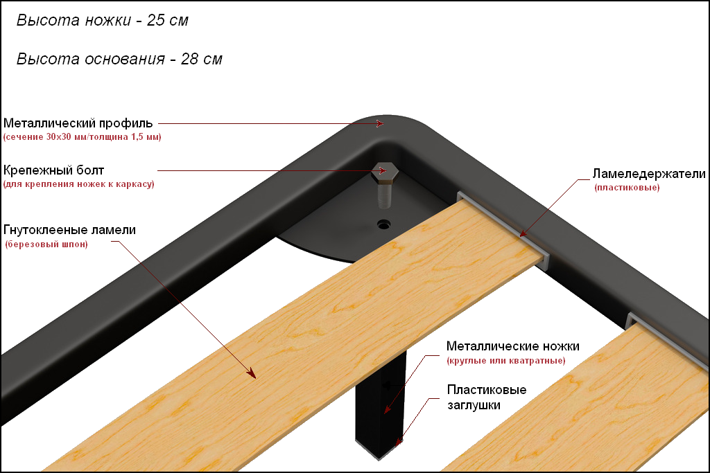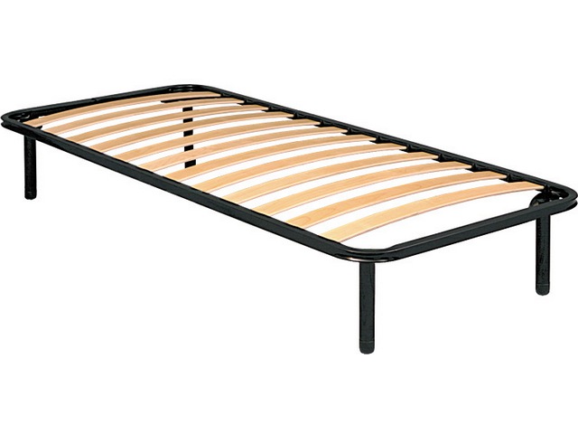 РАЗБОРНОЕ ОРТОПЕДИЧЕСКОЕ ОСНОВАНИЕ изготовлено из металлической трубы 30х30 мм толщиной 1.5 мм, с порошковым полимерным покрытием черного цвета, имеет 13 рядов берёзовых ламелей, установленных в латодержатели из полиэтилена высокого давления, комплектуется ножками высотой 250 мм из трубы квадратного или круглого сечения с пластиковыми опорами и резьбовым соединением.
